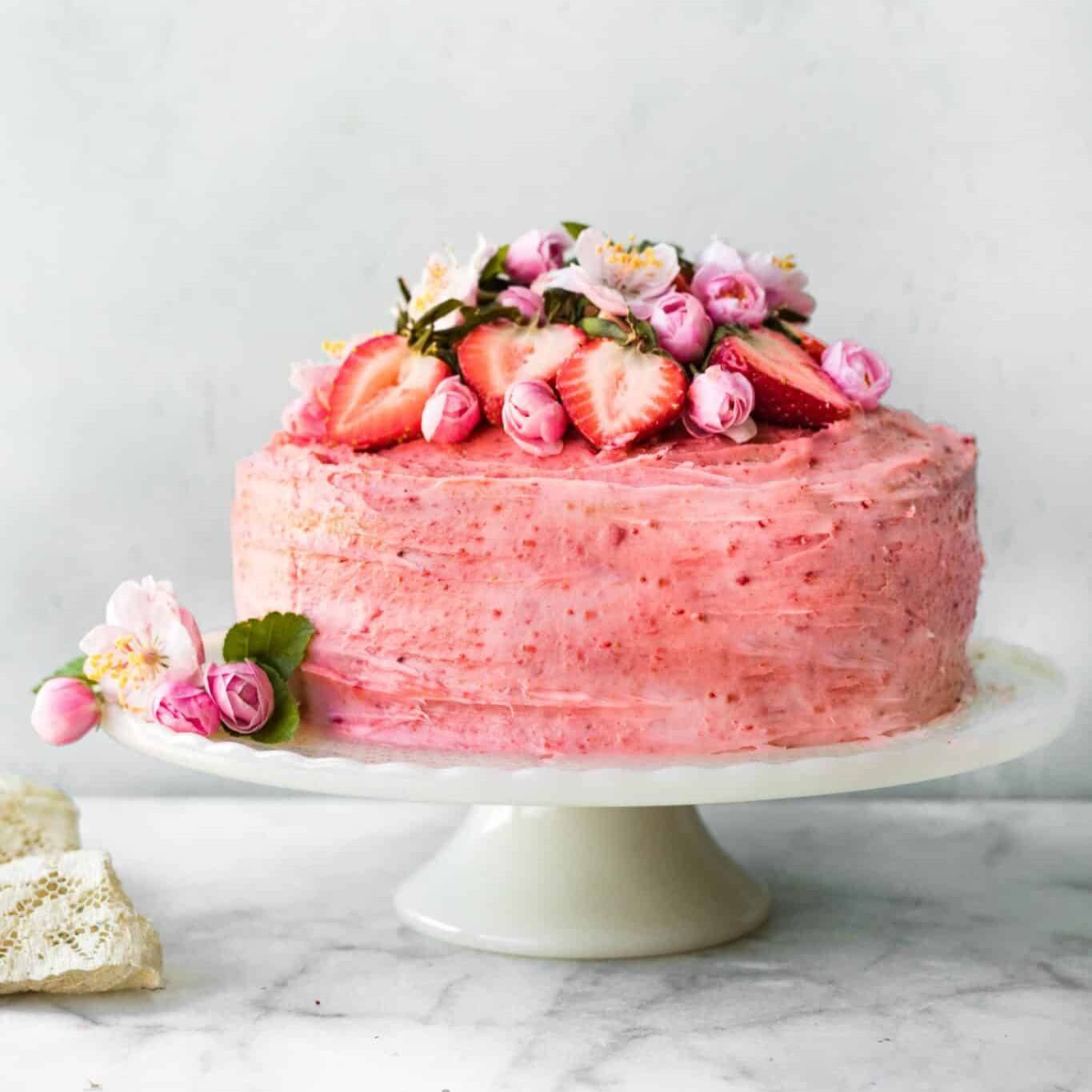 This fluffy cake and decadent frosting are made with fresh strawberries and simple ingredients for a dessert worthy of sharing!